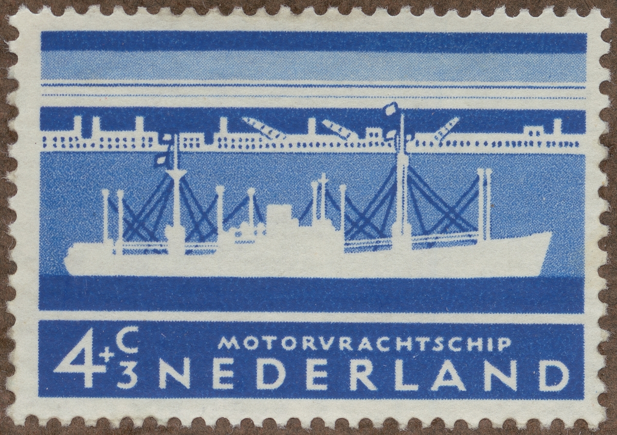 Frimärke från Nederländerna, 1957. Motiv av Holländskt fraktfartyg motordrivet