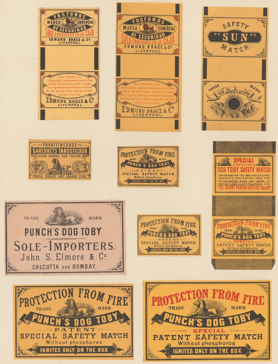 Etiketter för tändsticksaskar, från Svenskt Industri- och Handelsmuseum.
