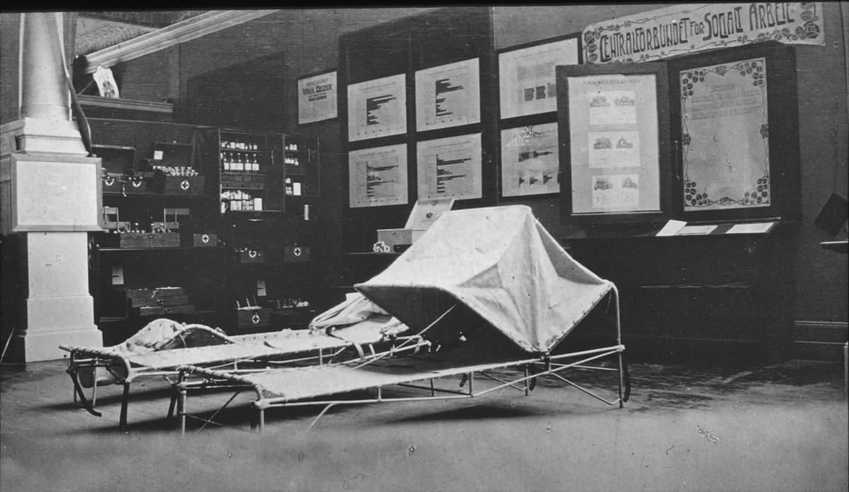 Skioptikonbild med motiv från yrkesinspektionens undersökningar på olika arbetsplatser. Utställningsmonter för Centralförbundet för socialt arbete.