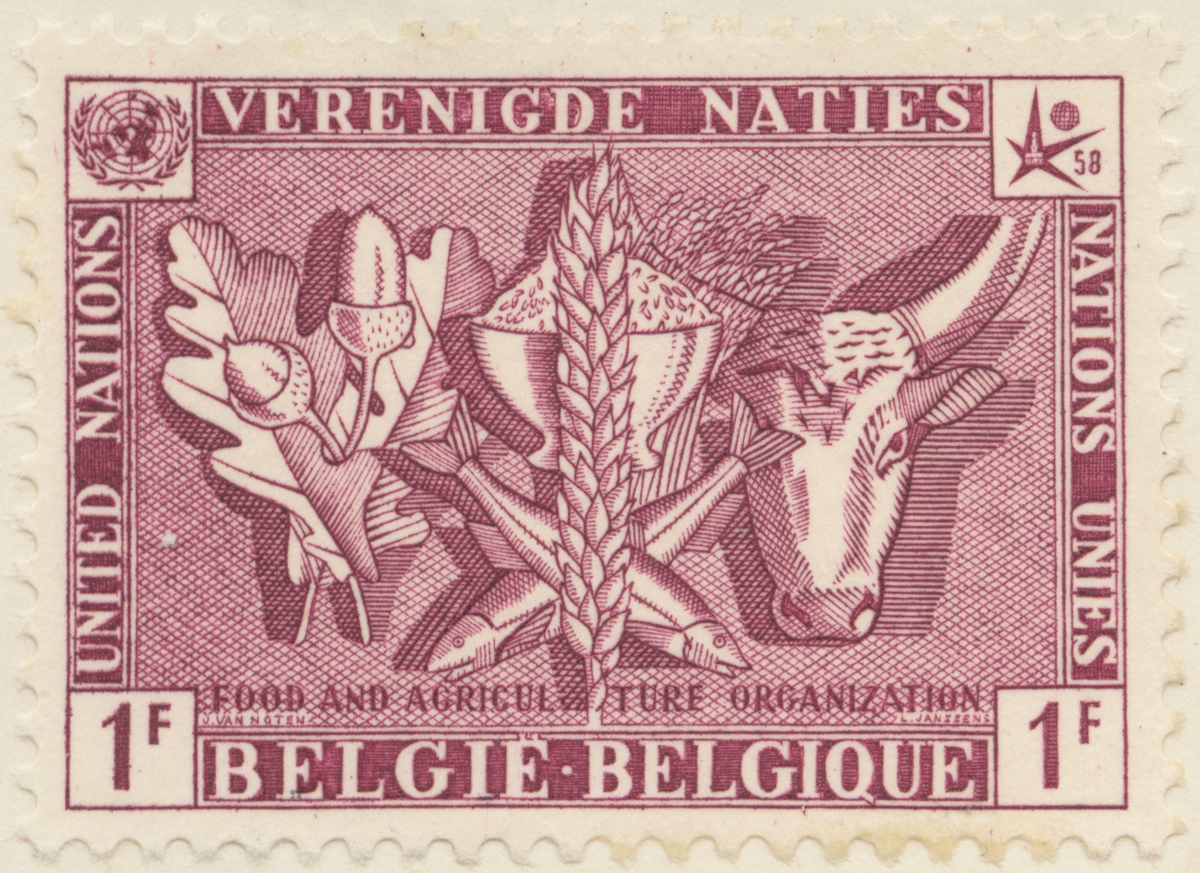 Frimärke från Belgien, 1958. Motiv av Symboler: Näringsorganisationer -Propaganda för Bryssel Utställningen 1958. "- FN-serie."