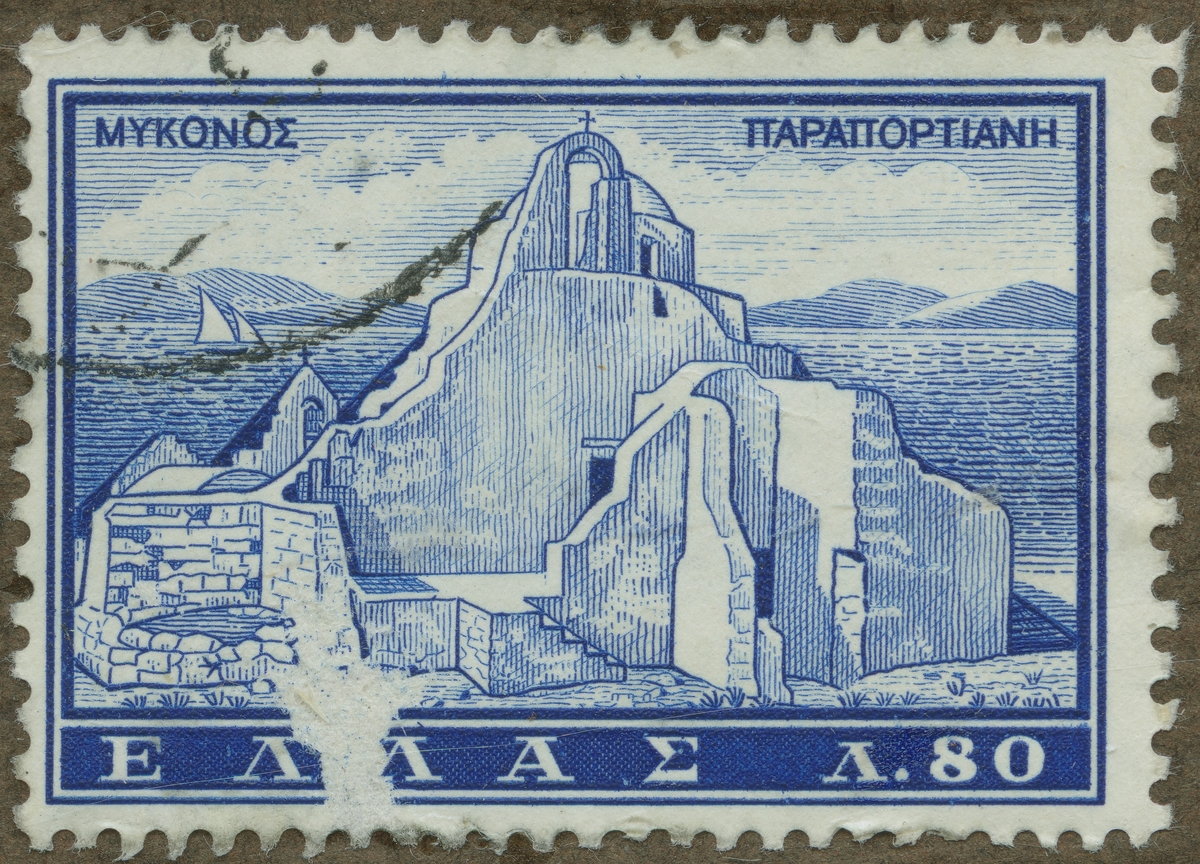 Frimärke från Grekland, 1961. Motiv av kyrkoruin på ön Mykonos. "Turist Serie".