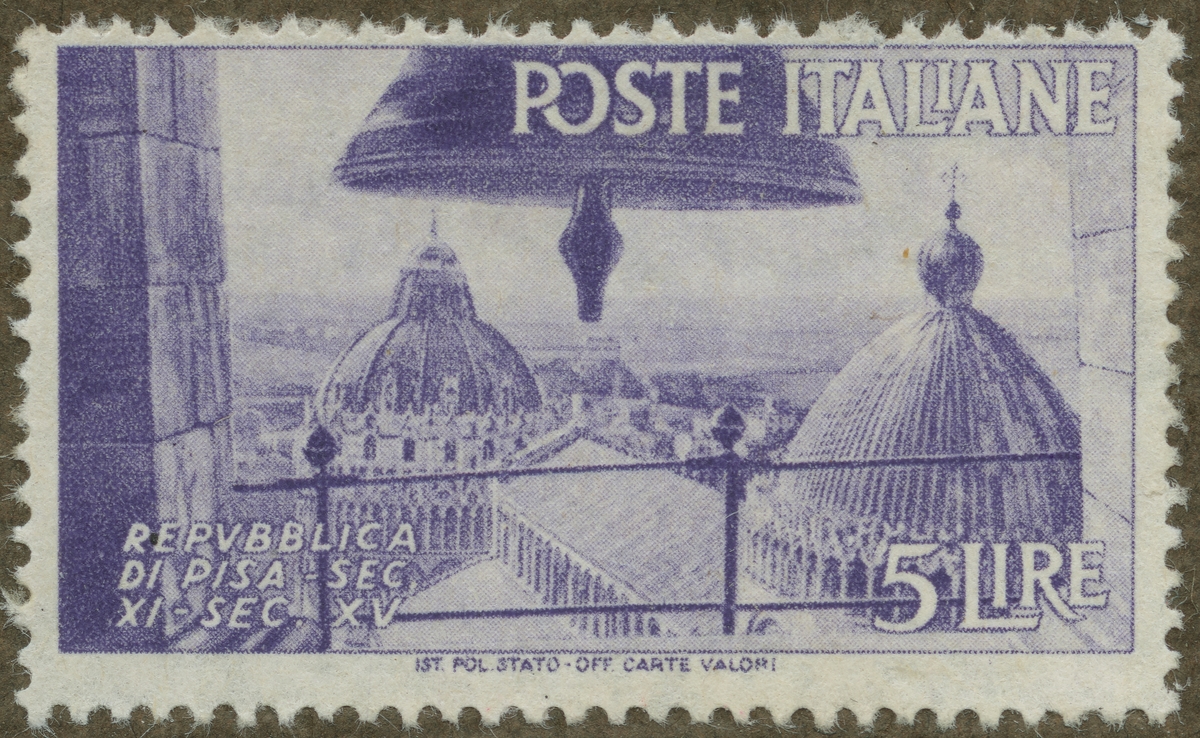 Frimärke från Italien, 1946. Motiv av Domen i Pisa. Minne av Republikens proklamation 1946. "Serie: Gamla italienska republiker. Pisa: 1000-1400-talet".