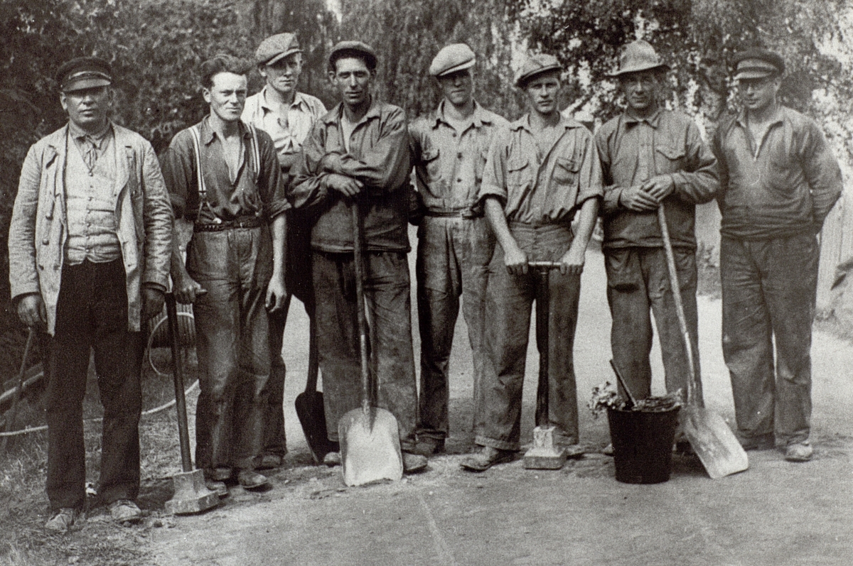 Kabelläggning i Ljusdal 1936. Personer från vänster Lagbas Johan Thorell, fast anställde linjearbetaren Birger kristoffersson och tillfälligt anställde Uno Nilsson. 6:e från vänster tillfälligt anställde Erik Andersson, som senare bytt sitt efternamn till Barås.
