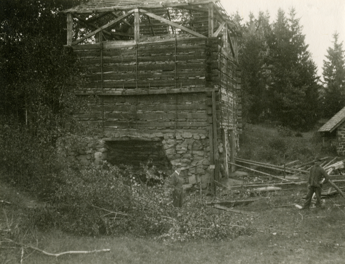 Trehörnings mulltimmerhytta under restaurering i september 1932. Hyttan tillhör Skyllbergs Bruks AB och står under uppsikt av Lerbäcks Hembyggdsförening.