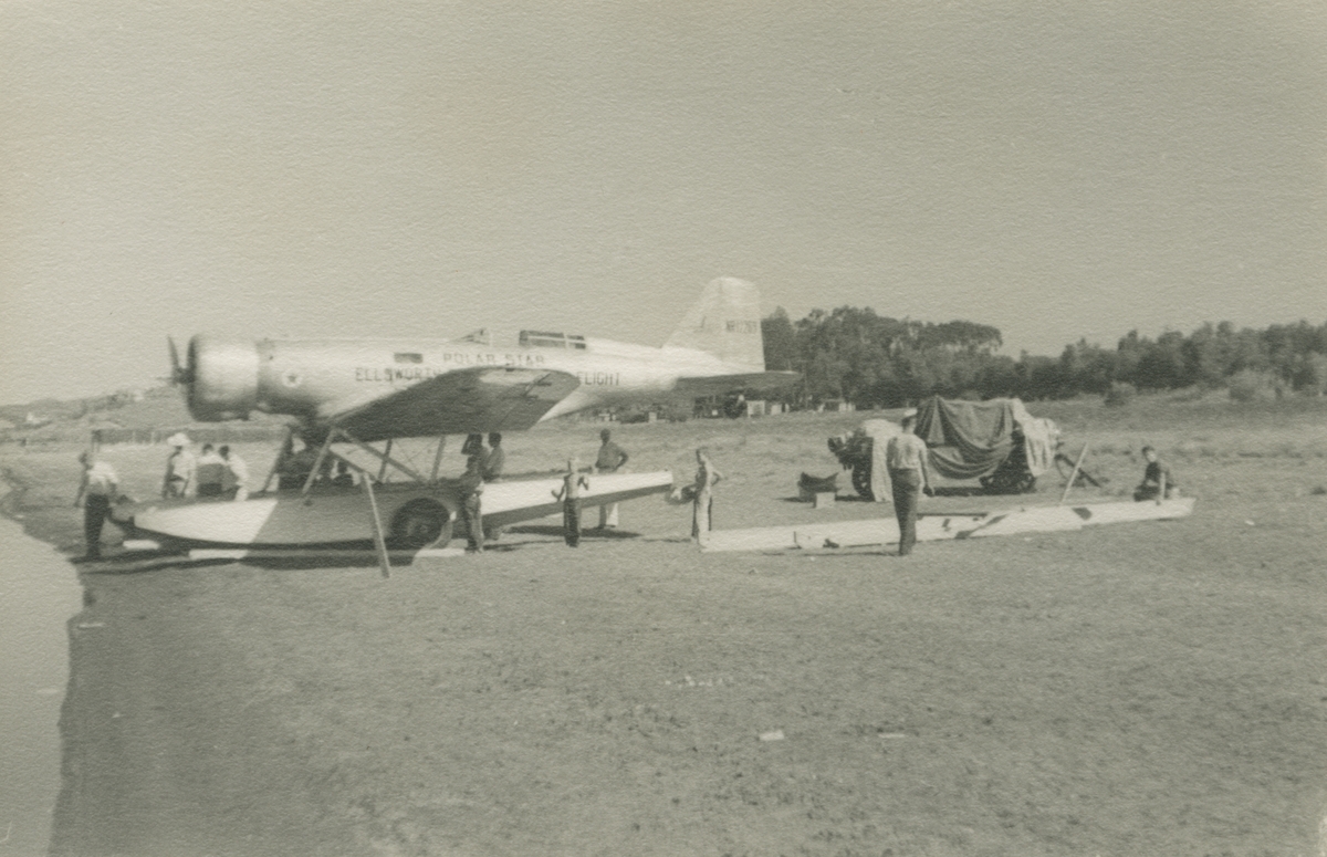 Fotografi från låda märkt Bernt Balchen. Balchen var norsk-amerikansk flygare, polarforskare och militär. Motiv av människor och flygbåt på strand.