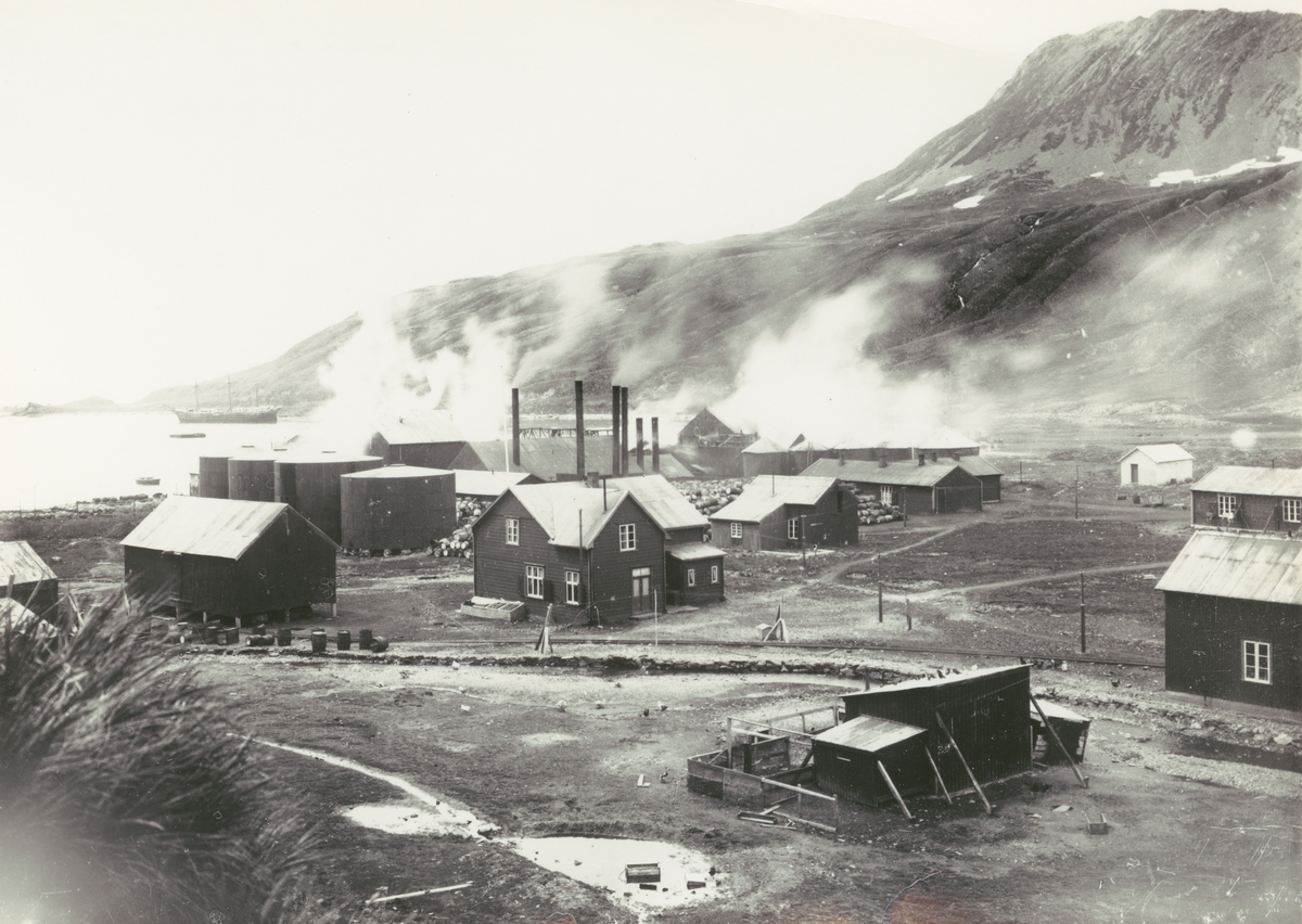 Bild från expedition i Antarktisområdet. Motiv av ett antal hus nedanför berg.