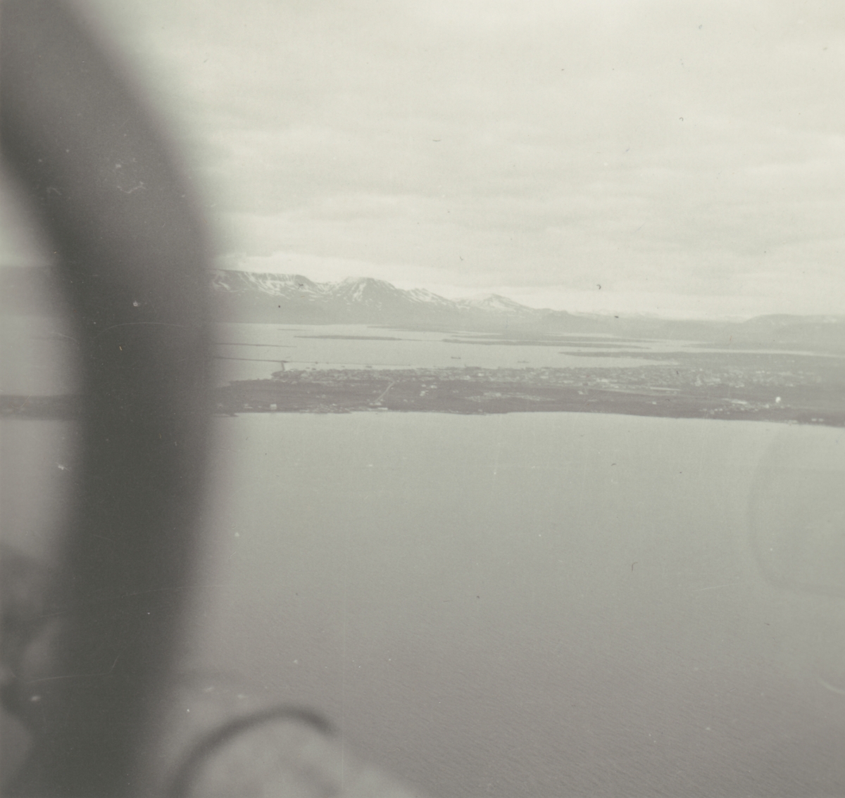 Fotografi från Albin Ahrenbergs resa till Grönland 1929. Vy över hav och berg.