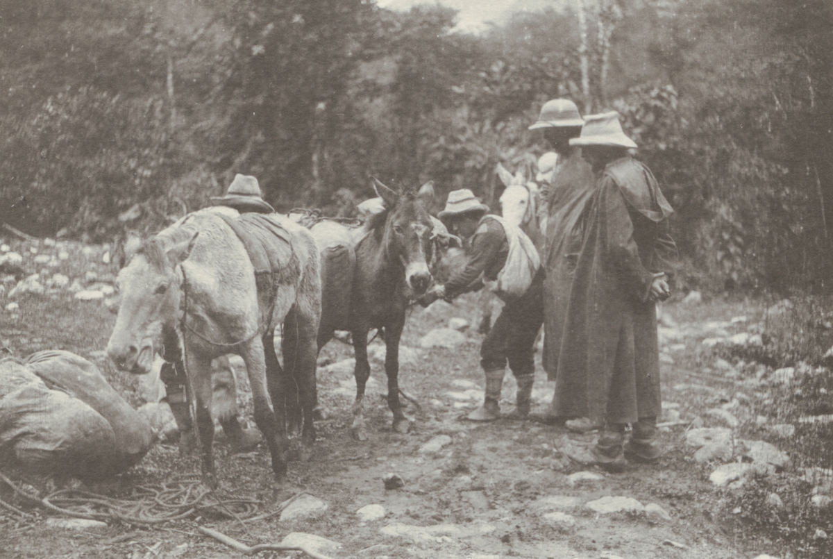 Fotografi från kuvert märkt med "Ernst Nordenskjöld". Motiv av expeditionsdeltagare och hästar i djungel.