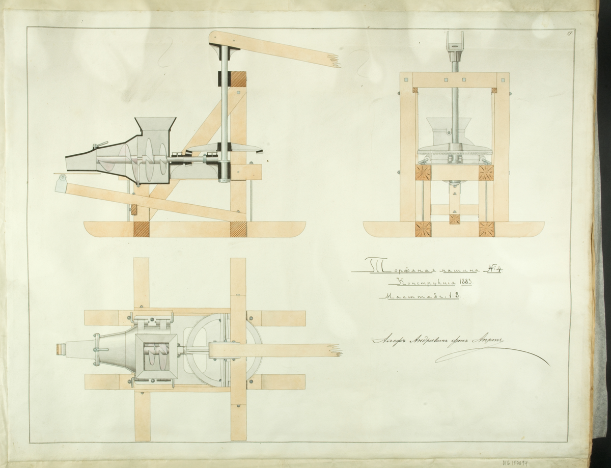 Skiss på ryska 1883, ur boken med ritningar mm 1868-1887, av den svenske torvmaskinkonstruktören Aleph Anrep.