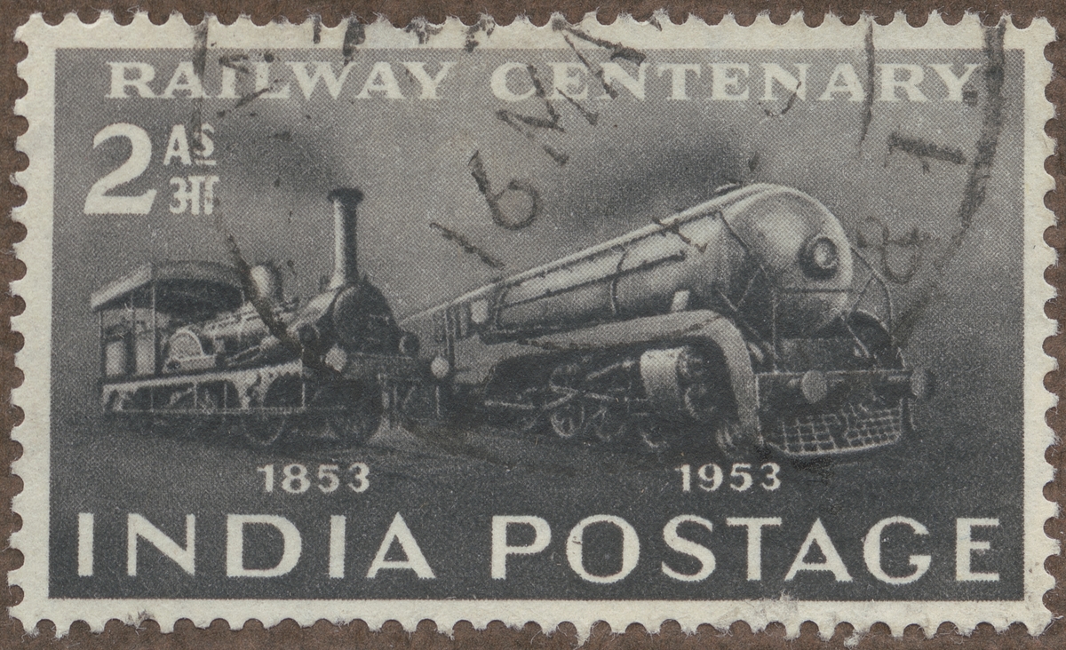 Frimärken ur Gösta Bodmans filatelistiska motivsamling, påbörjad 1950. Frimärke från Indien, 1953. Motiv av Indiska lokomotiv av 1853 och 1953 "-Indiens järnvägar 100 år:- 1853-1953."