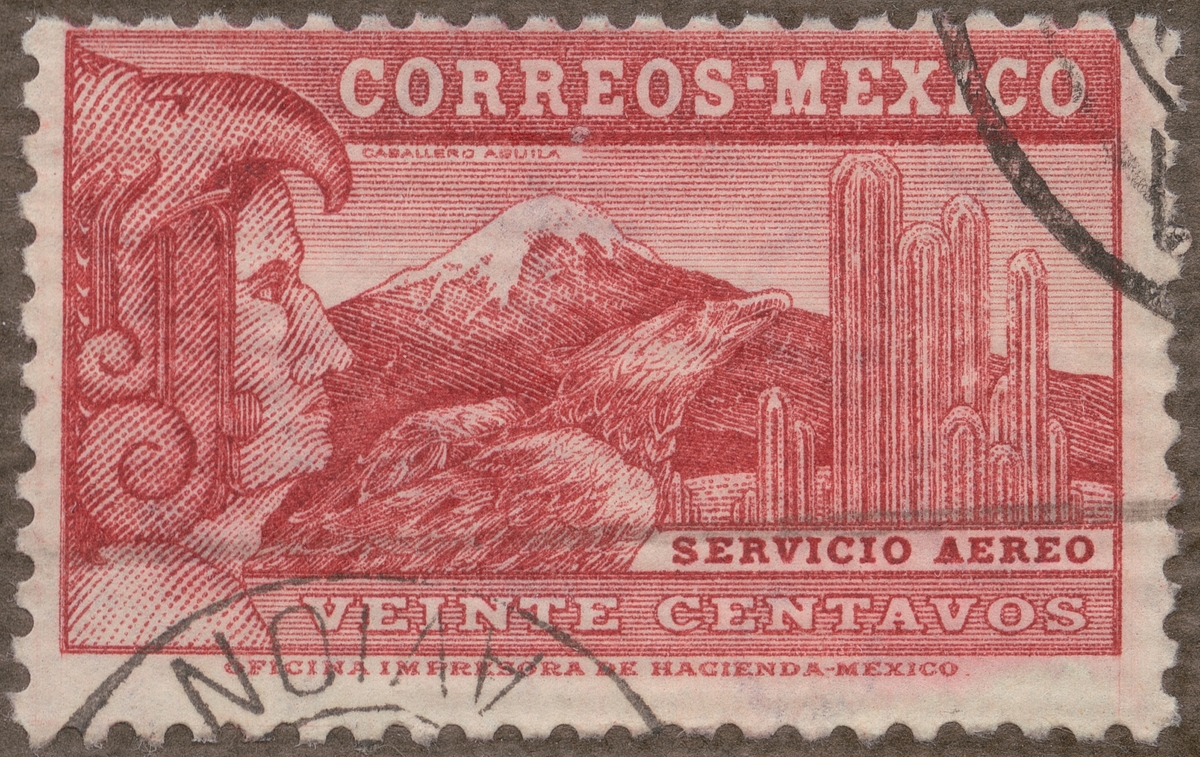 Frimärke från Mexico, 1934. Motiv av Symbol för flyget: "Caballero Aquila" eller "Örnmannen" mot Popocatepetlberget i bakgrunden.