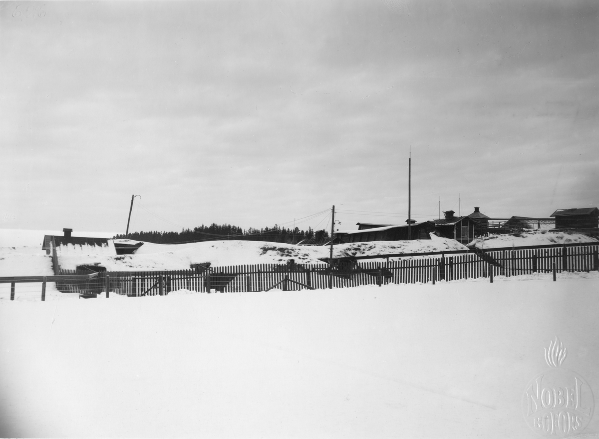 AB Bofors Nobelkrut. Nitroglycerinfabriken. Till höger nitreringshuset. Till vänster tvätthuset. Husen är omgivna av skyddsvallar.