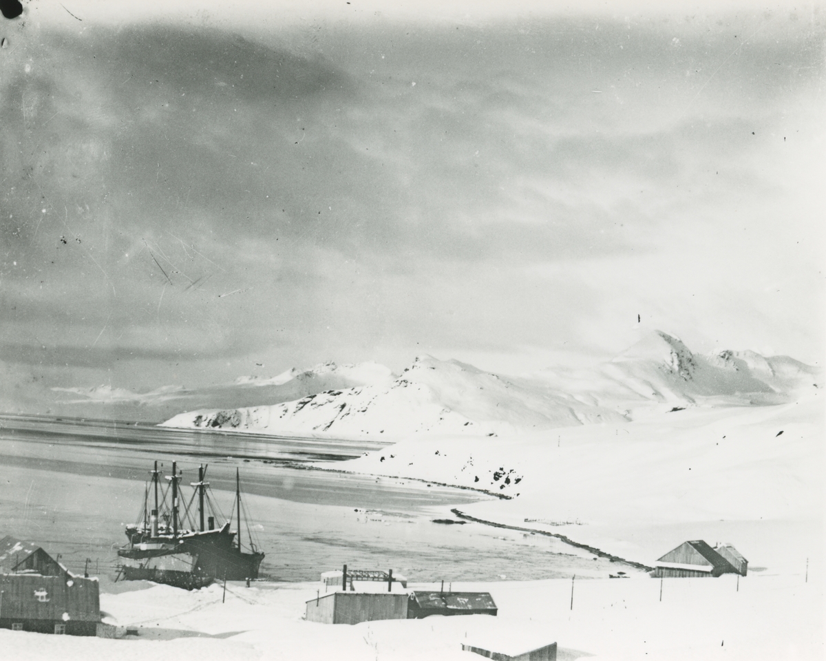 Bild från expedition i Antarktisområdet. Vy över snötäckt valfångststation.