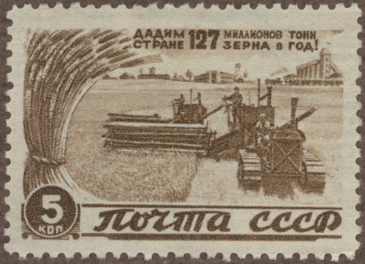Frimärke från Ryssland, 1946. Motiv av Traktordragen skördemaskin Stalins fem-årsplan 1946: "Giv landet varje år 127 tons spannmål"