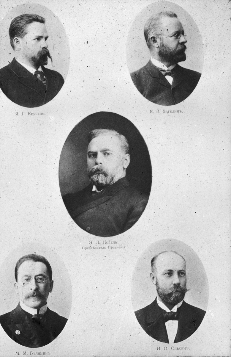 Porträtt av Dr. Emanuel Nobel ( i mitten), M.M. Beliamin (nedre vänster), Hans Olsen (nedre höger), K.W.Hagelin (övre höger) samt Hjalmar Crusell (övre vänster), Nobels styrelse 1905.