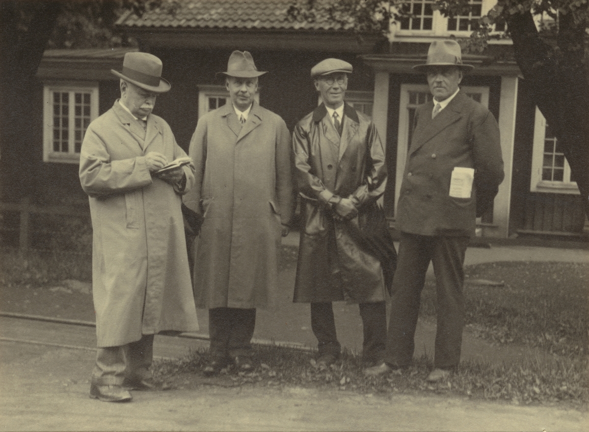 Carl Sahlins och Torsten Althins på besök vid Boxholms Bruk 1932. Från vänster, Carl Sahlin, Disponent Elis Wettergren, Ingenjör Erik Dahberg och Spikverkmästare Rupert Isaksson. Fotograf Torsten Althin.