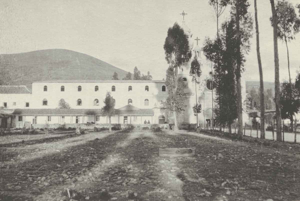 Fotografi från kuvert märkt med "Ernst Nordenskjöld". Motiv av åker framför stor vit byggnad.