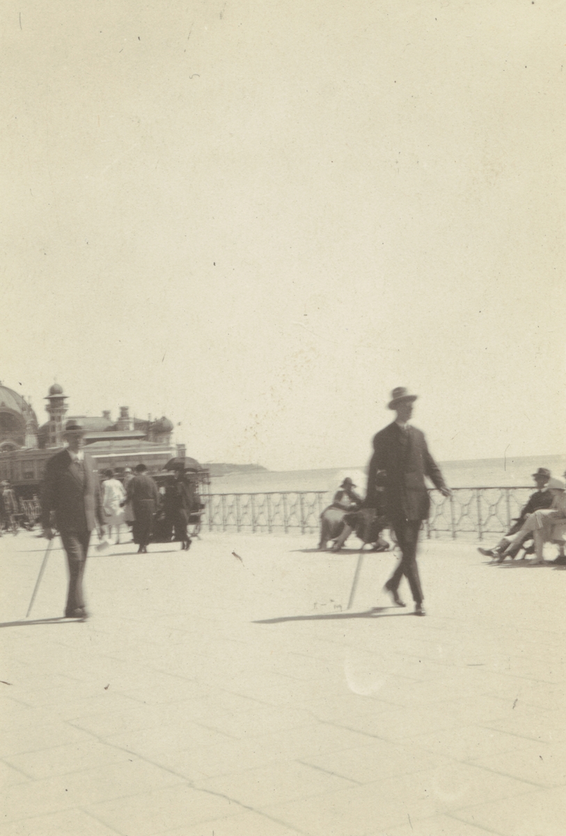 Fotografi från Albin Ahrenbergs resa till Grönland 1929. Motiv av män med promenadkäppar som går på strandpromenad.