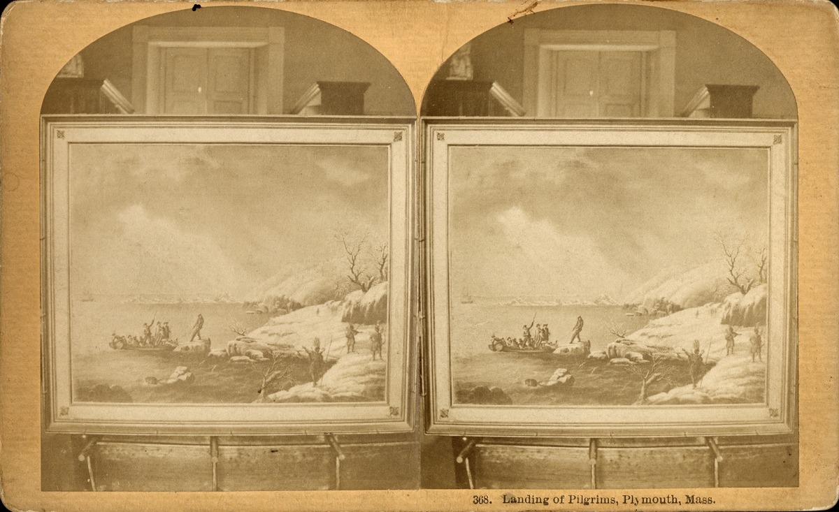 Stereobild av tavla föreställande Pilgrimers ilandstigning, Plymouth, Massachusett.