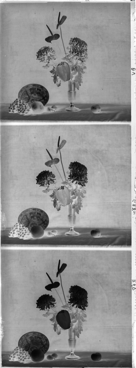 Skioptikonbild från institutionen för fotografi vid Kungliga Tekniska Högskolan. Stilleben. Bilden visar negativ för användning i Chromoskop för direkt betraktande av tre-färgsdiapositiv enligt additiv metod. Använd av professor Helmer Bäckström (och dessförinnan) av docent John Hertzberg som undervisningsmaterial. Bäckström var Sveriges förste professor i fotografi vid Kungliga Tekniska Högskolan 1948-1958. För mer info: se Fotografisk Handbok av Helmer Bäckström. Natur och Kultur. Andra omarbetade upplagan 1958-59. Kap 129 Färgfotografiska metoder - en översikt (sid 965 och följande). (För användning i kromoskop liknande föremålet TM45560).