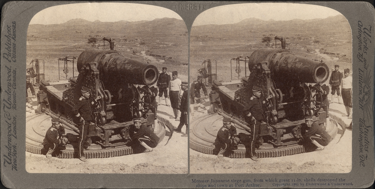 Stereobild av soldater invid stort belägrings vapen, från vilken bomber förstörde skepp och staden Port Arthur.