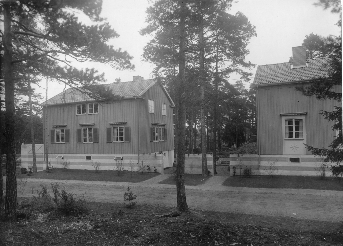 Bygge och Bo-utställningen i Äppelviken 1927. Till vänster hus nr 25 på sex rum och kök. Till höger hus nr 24 på sex rum och kök. Båda ritade av Ernst Spolén.