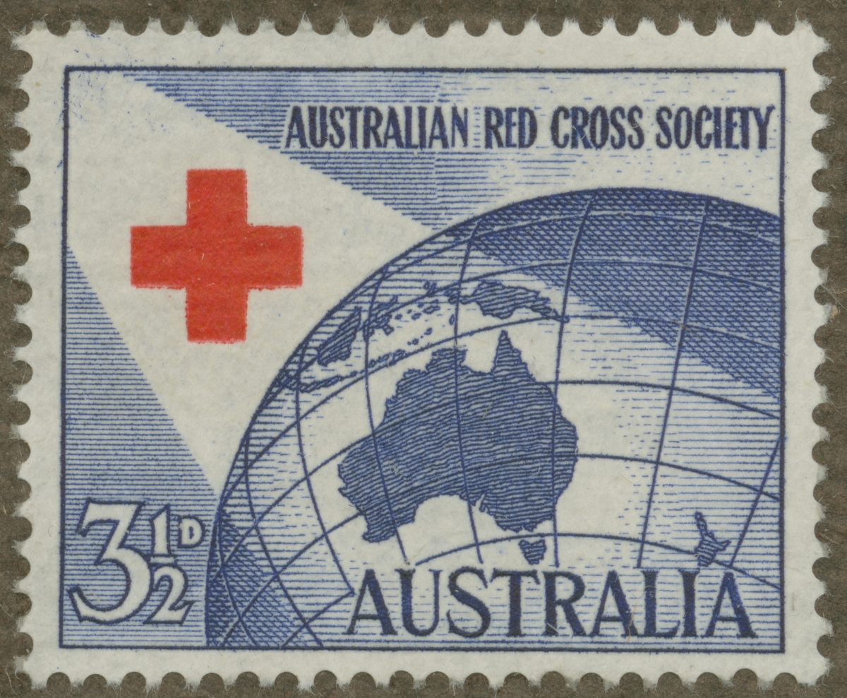 Frimärke från Australien, 1954. Motiv av jordglob. Karta över Australien. "Röda Kors propaganda".