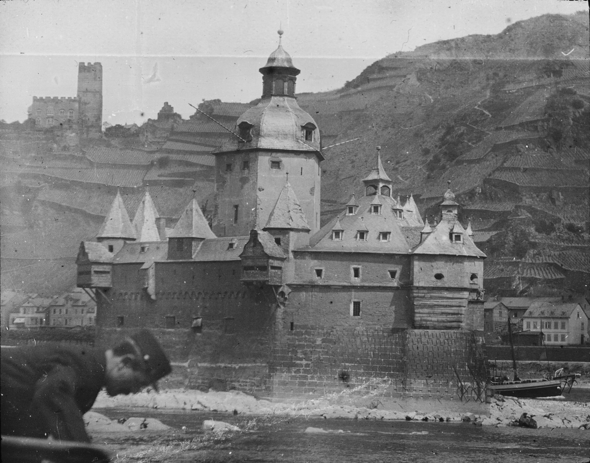 Skioptikonbild med motiv från Sigurd Curmans resor i Europa. Slott längs Rhen mellan Frankfurt och Hannover.