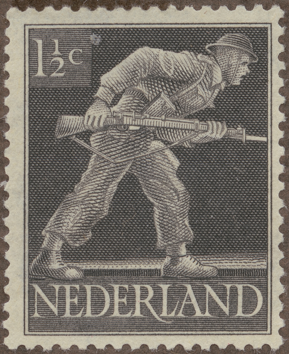 Frimärke från Nederländerna, 1944-46. Motiv av Infanterist Vapen "Serie: märkena använda på holländska krigs- & handelsskepp till Hollands frigörelse, världskrig II."