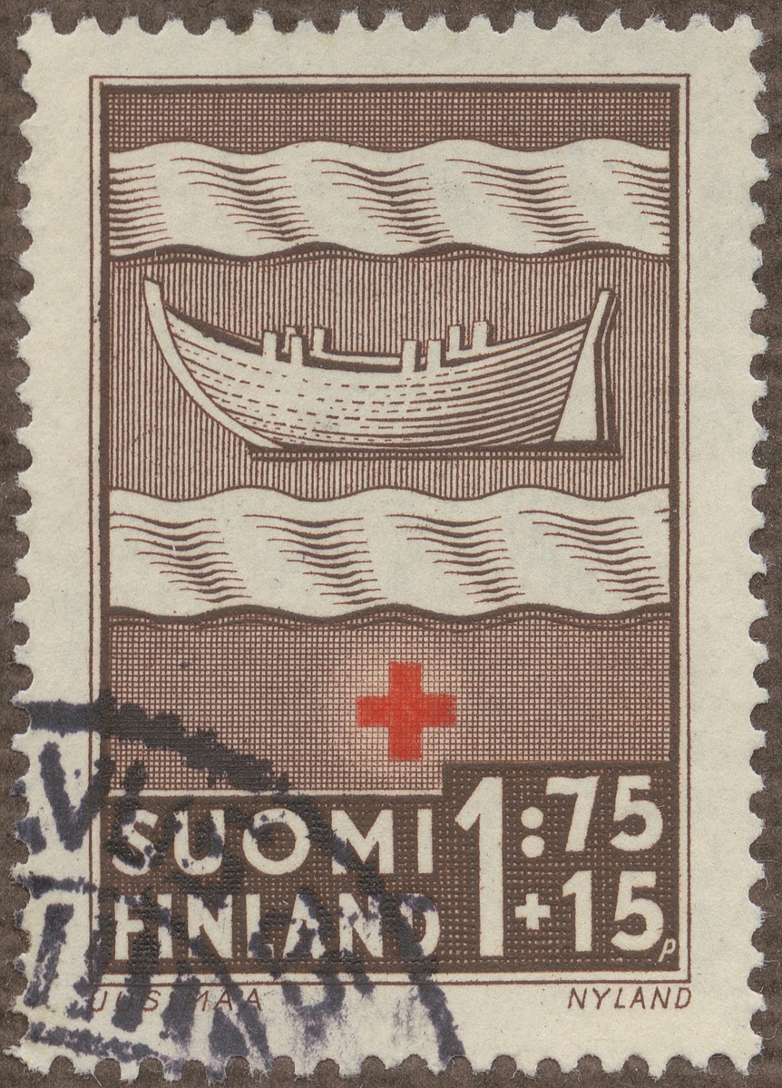 Frimärke från Finland, 1942. Motiv av Finsk roddbåt för fyra åror Nylands vapen