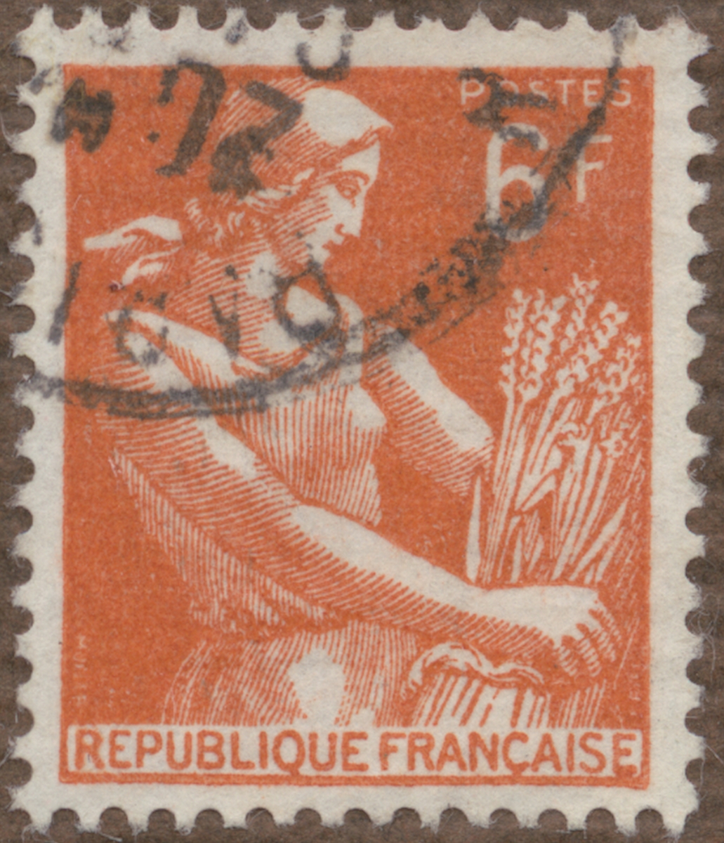 Frimärke från Frankrike, 1957. Motiv av Bondkvinna med vetekärve