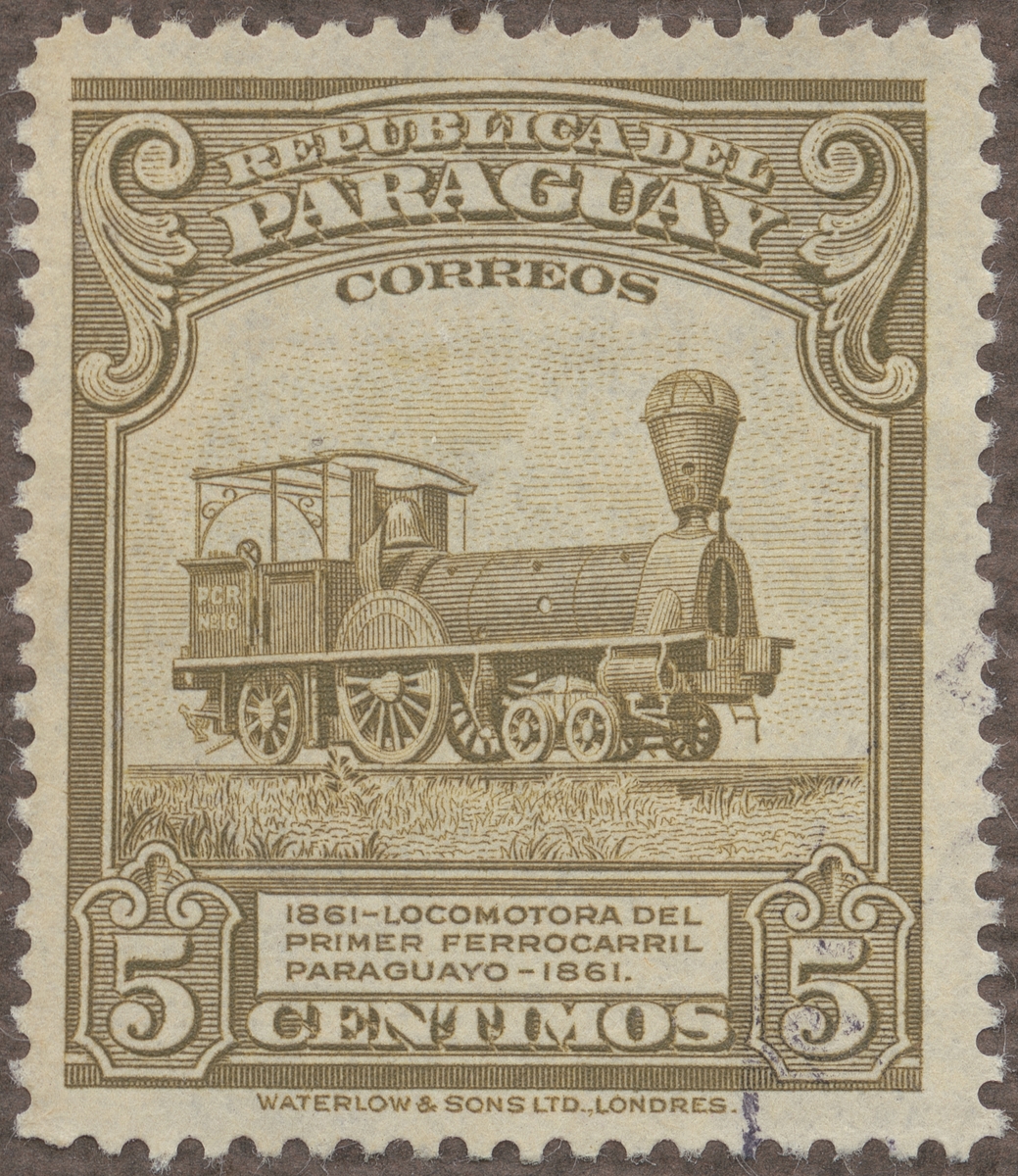 Frimärken ur Gösta Bodmans filatelistiska motivsamling, påbörjad 1950. Frimärke från Paraguay, 1944. Motiv av Första ånglokomotivet i Paraguay: år 1861.