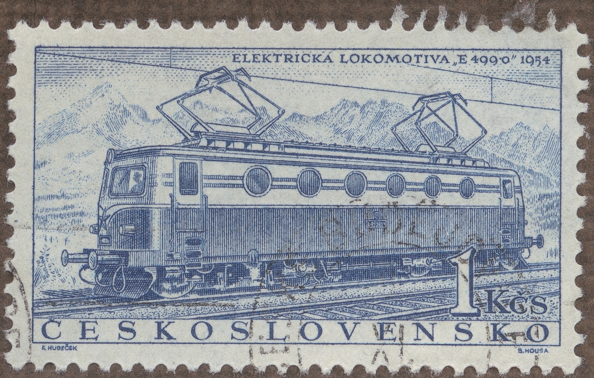 Frimärken ur Gösta Bodmans filatelistiska motivsamling, påbörjad 1950. Frimärke frånTscheckoslovakiet, 1956. Motiv av Elektriska Lokomotivet "E. 499" 1954 "Lokomotiv Serie.-"