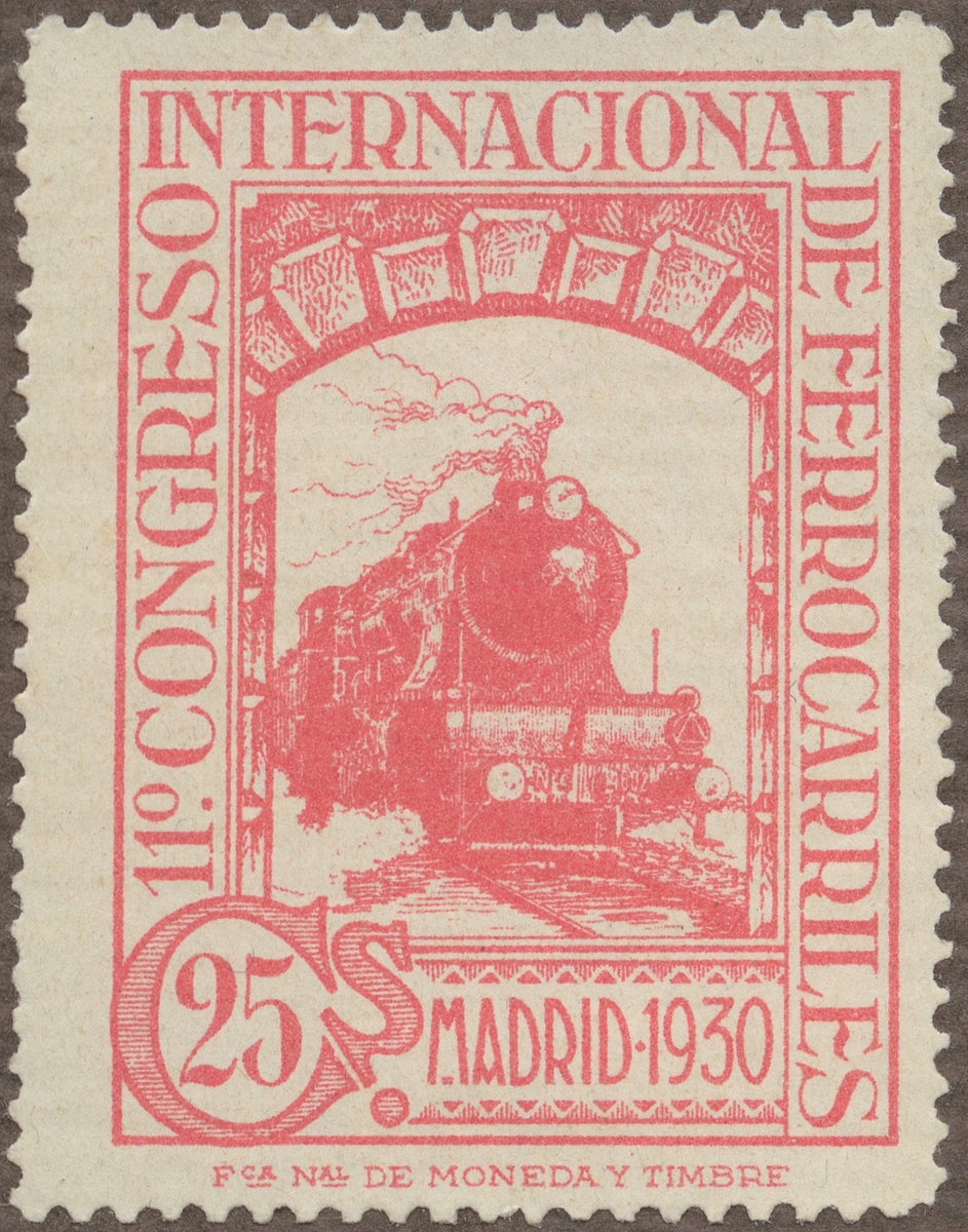 Frimärken ur Gösta Bodmans filatelistiska motivsamling, påbörjad 1950. Frimärke från Spanien, 1930. Motiv av Spanskt ånglokomotiv av 1930 "11-te internat. järnvägskongressen"