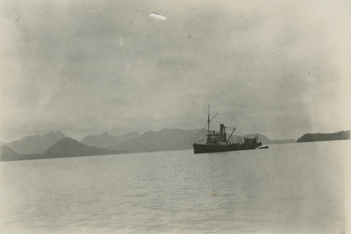 Fotografi från expedition till Peru 1920. Vy över hav och fartyg. I bakgrunden syns berg.