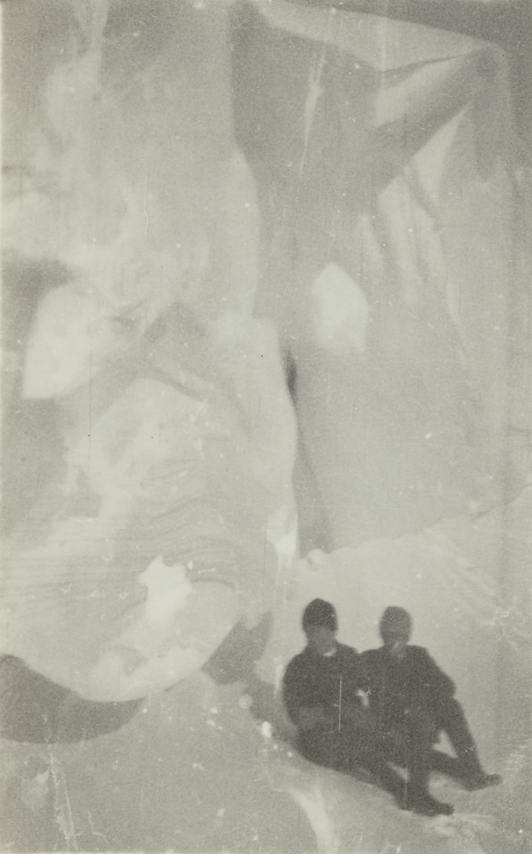 Fotografi från expedition till Spetsbergen. Motiv av två män som vilar sig nedanför ett isberg.