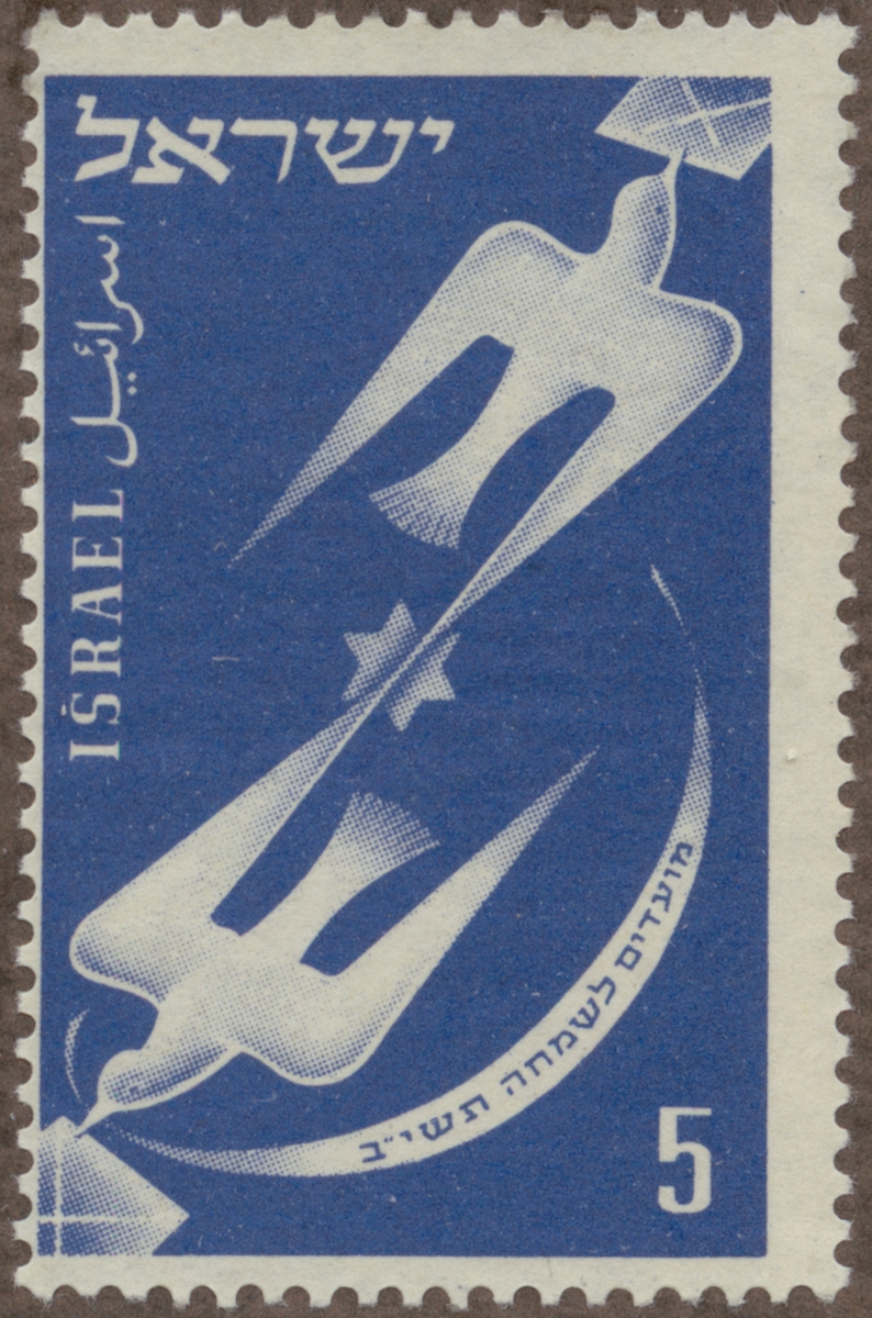 Frimärke från Israel, 1953. Motiv av Brevduvor Märke till frankering av nyårspost (judiska året 5712) samt de judiska helgdagar.