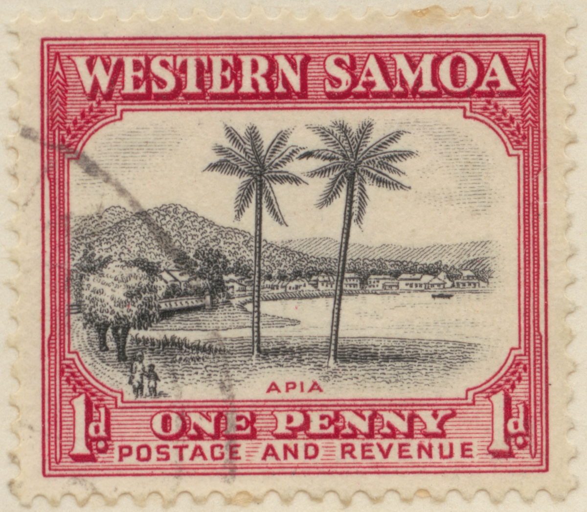 Frimärke från Samoaöarna, 1935. Motiv av palmer vid huvudstaden Apia på ön Upolu.