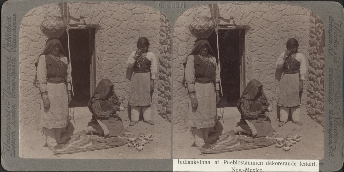 Stereobild av Indiankvinnor, tillhörande Publostammen, dekorerar lerkärl.