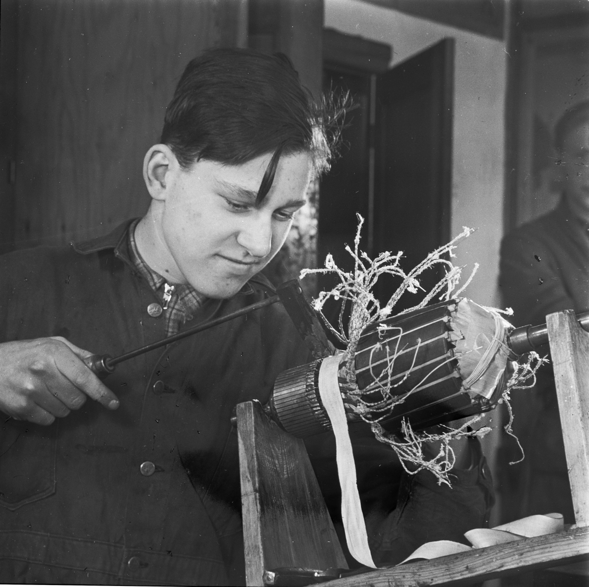 Ljusbild gällande ungdomens framtidsutsikter på hantverks- och industriområdet. Ung man, elev, arbetande i verkstad.