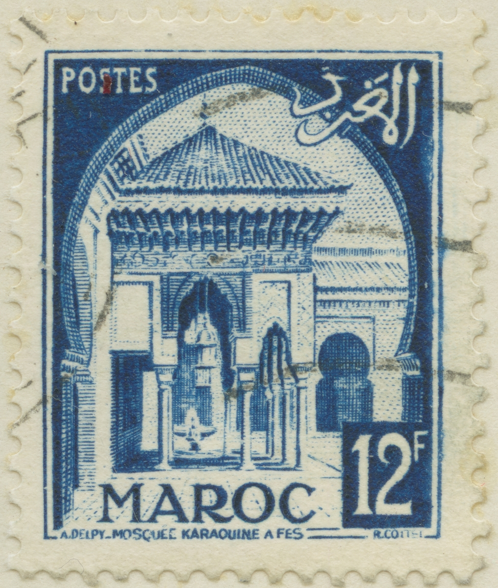 Frimärke från Franska Marocko, 1951. Motiv av moskéen Karaouin.