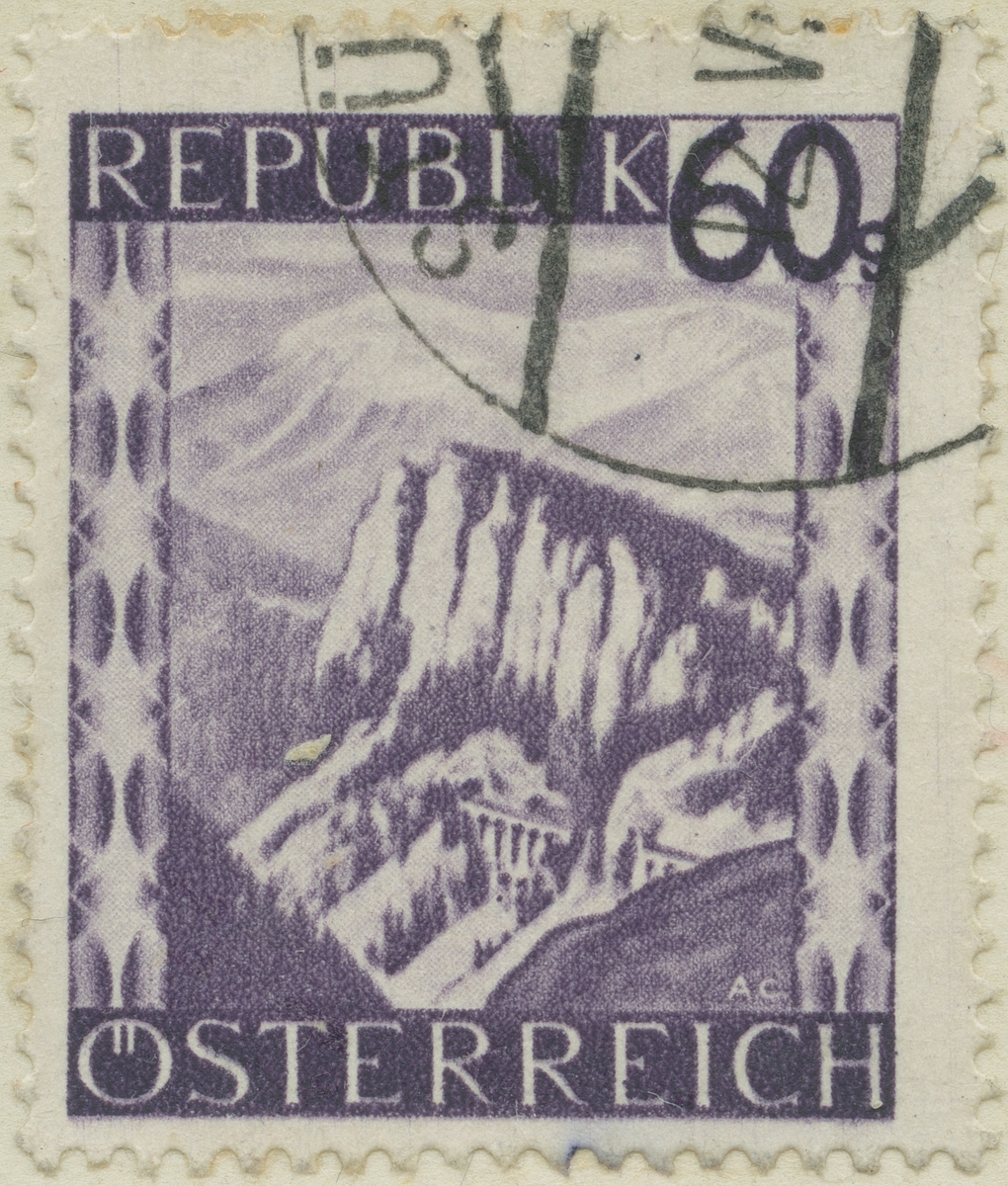 Frimärke ur Gösta Bodmans filatelistiska motivsamling, påbörjad 1950. Frimärke från Österrike, 1945. Motiv av Semmering Klippan