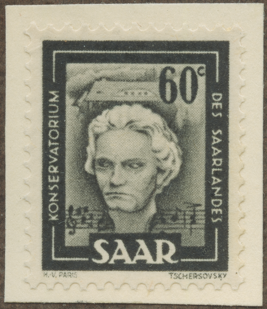 Frimärke från Saar, 1951. Motiv av Ludwig van Beethoven 1770-1827 Kompositör -Till fördel för konservatoriet i Saar-
