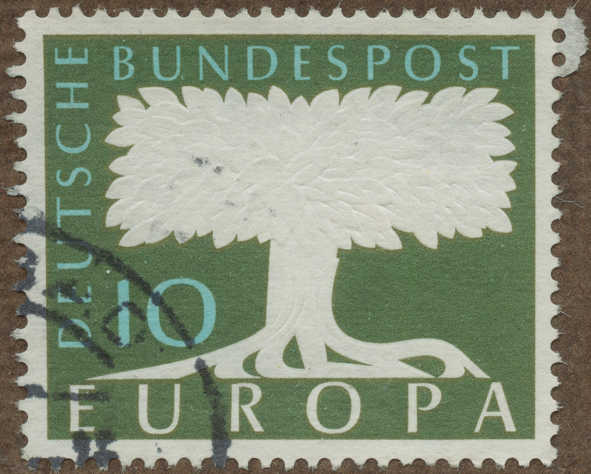 Frimärke från Väst Tyskland, 1957. Motiv av Ett stort träd Symbol för Europa