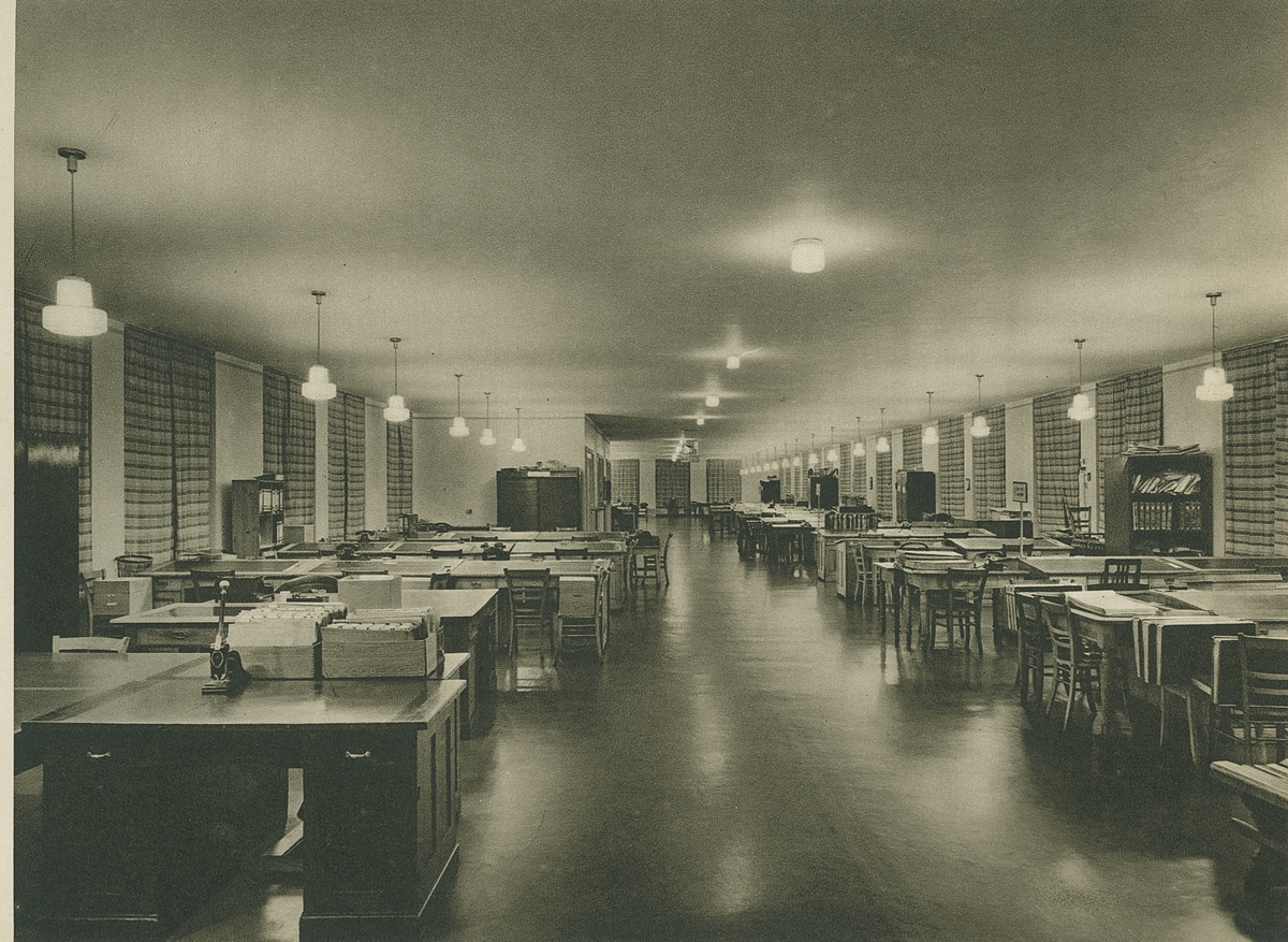 "Ein Grosser Büroraum", Büro der Allgemeinen Ortskrankenkasse, Berlin, Zonenspiegelleuchten HZ zu 200 watt, Planspiegelleuchten DPL 5 zu 100 watt".