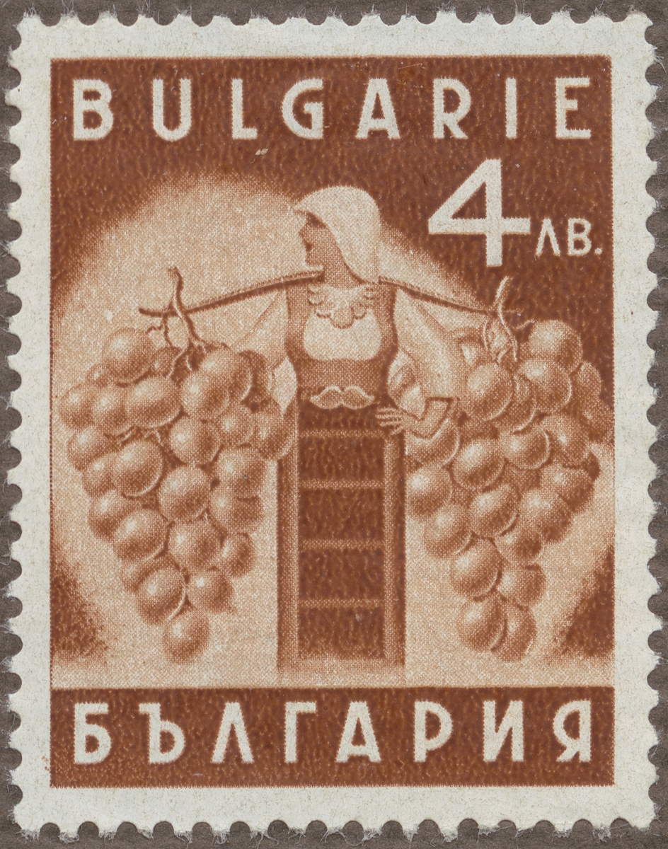 Frimärke från Bulgarien, 1938. Motiv bulgariska bondkvinnor med vindruvsklasar på ok. "Propagandaserie för inhemska lantbruksprodukter".