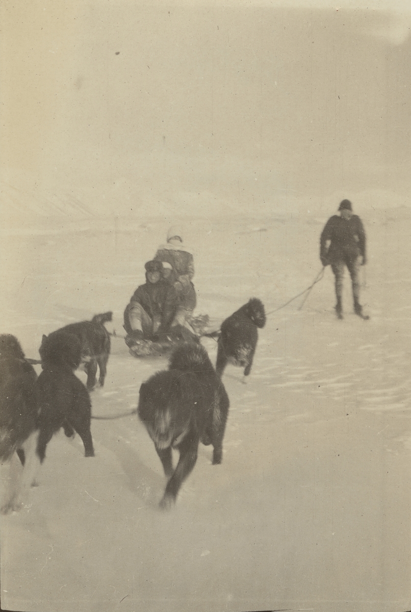 Fotografi från expedition till Spetsbergen. Motiv av två personer som blir dragna av hundspann i ett snölandskap. Bredvid åker en person på skidor.