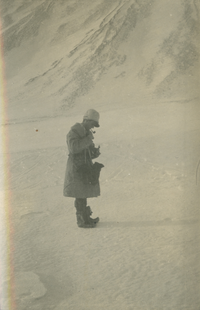 Fotografi från expedition till Spetsbergen. Motiv av man i vinterkläder stående i ett vinterlandskap och röker pipa.