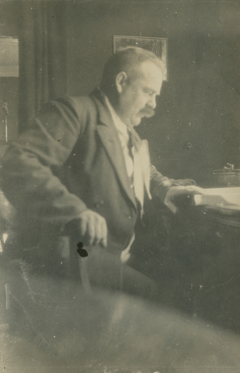 Fotografi från expedition till Spetsbergen. Motiv av mustaschprydd man klädd i kavaj som sitter inomhus vid skrivbord.