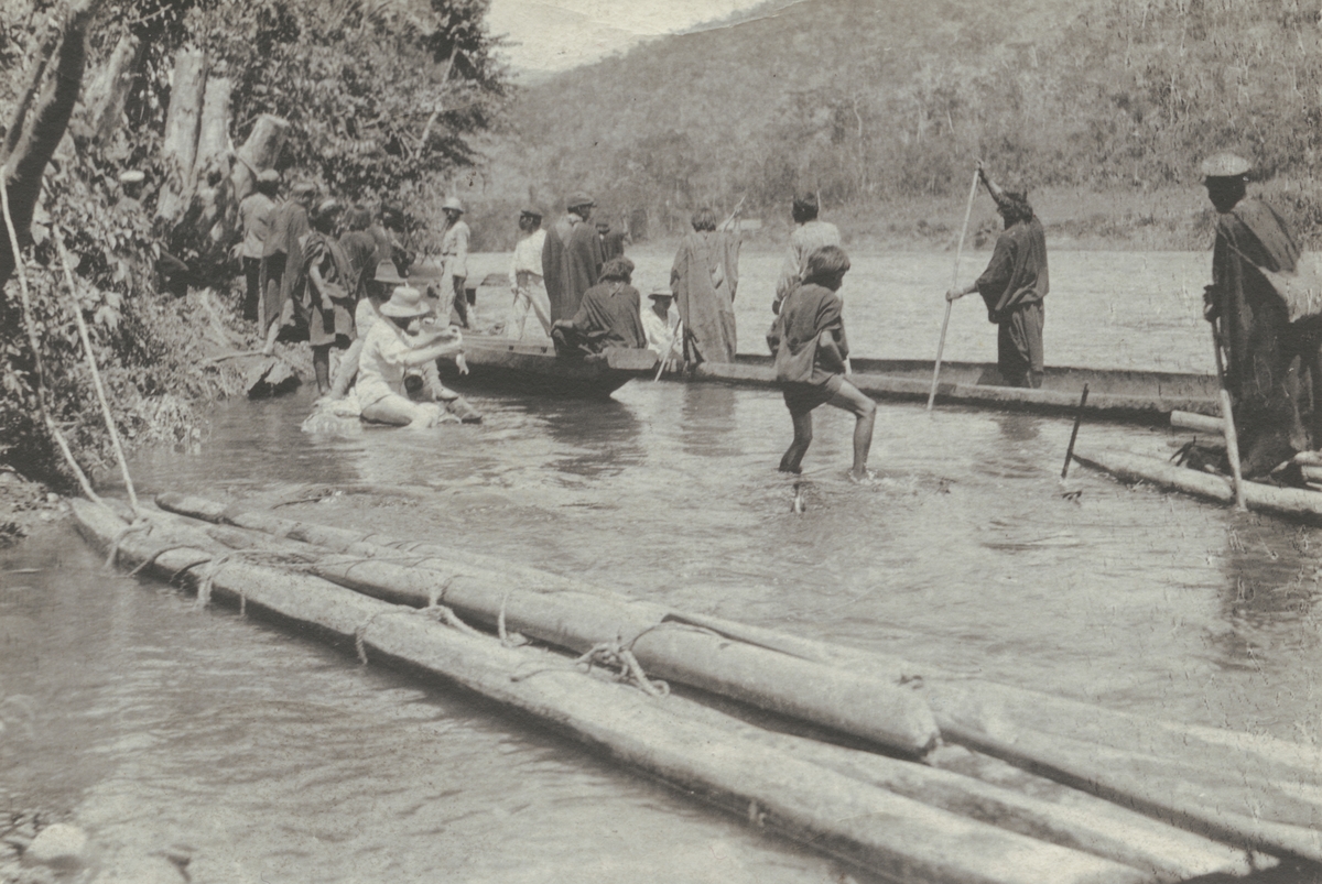 Fotografi från kuvert märkt med "Ernst Nordenskjöld". Expeditionsdeltagare och flottar i djungeln vid Perenéfloden.